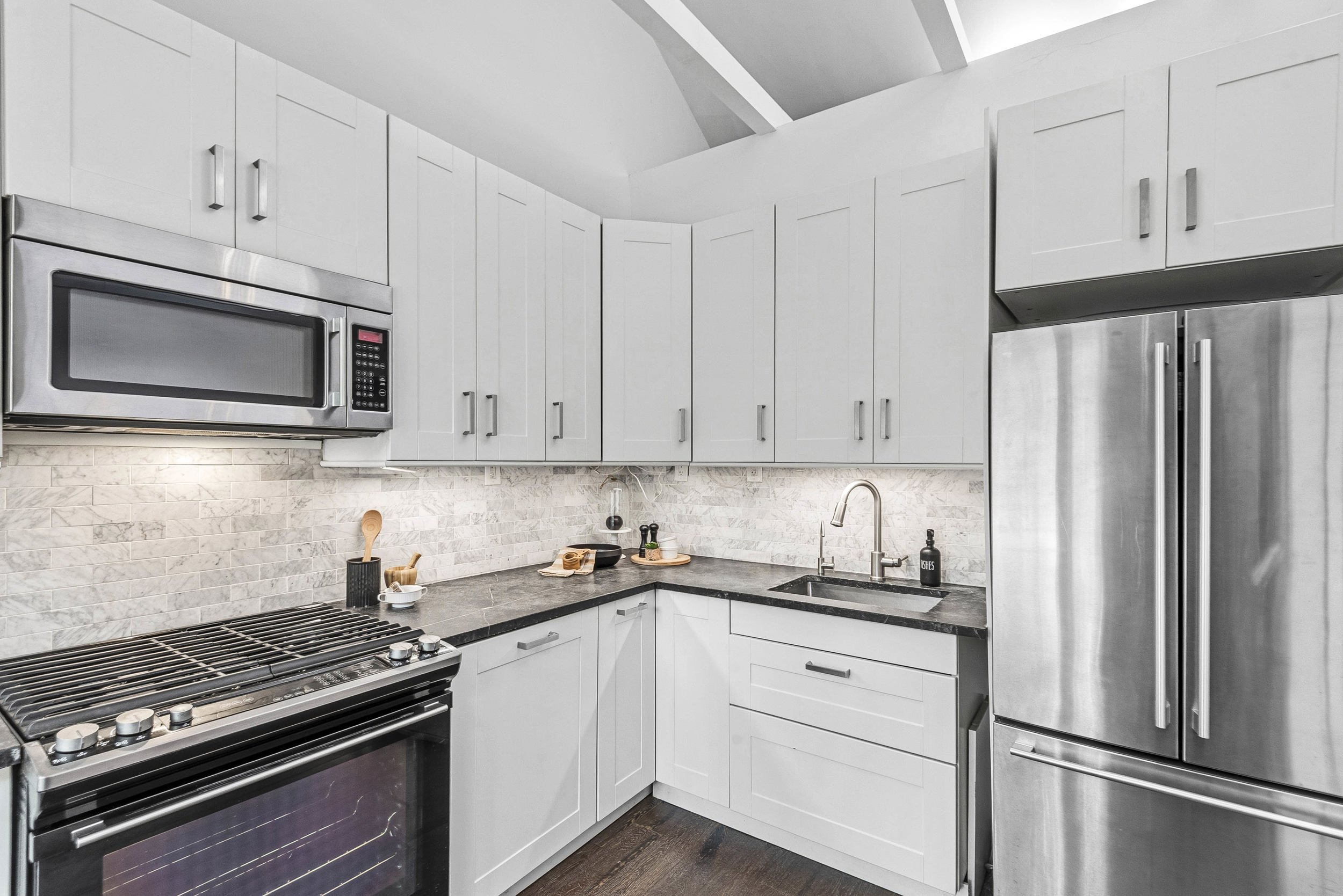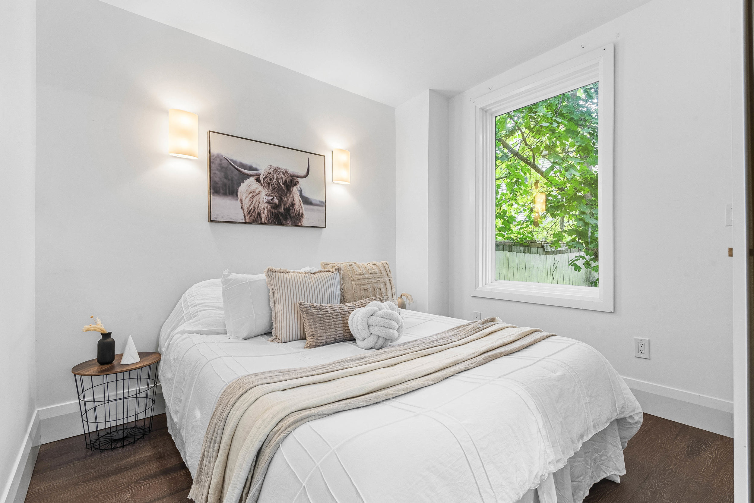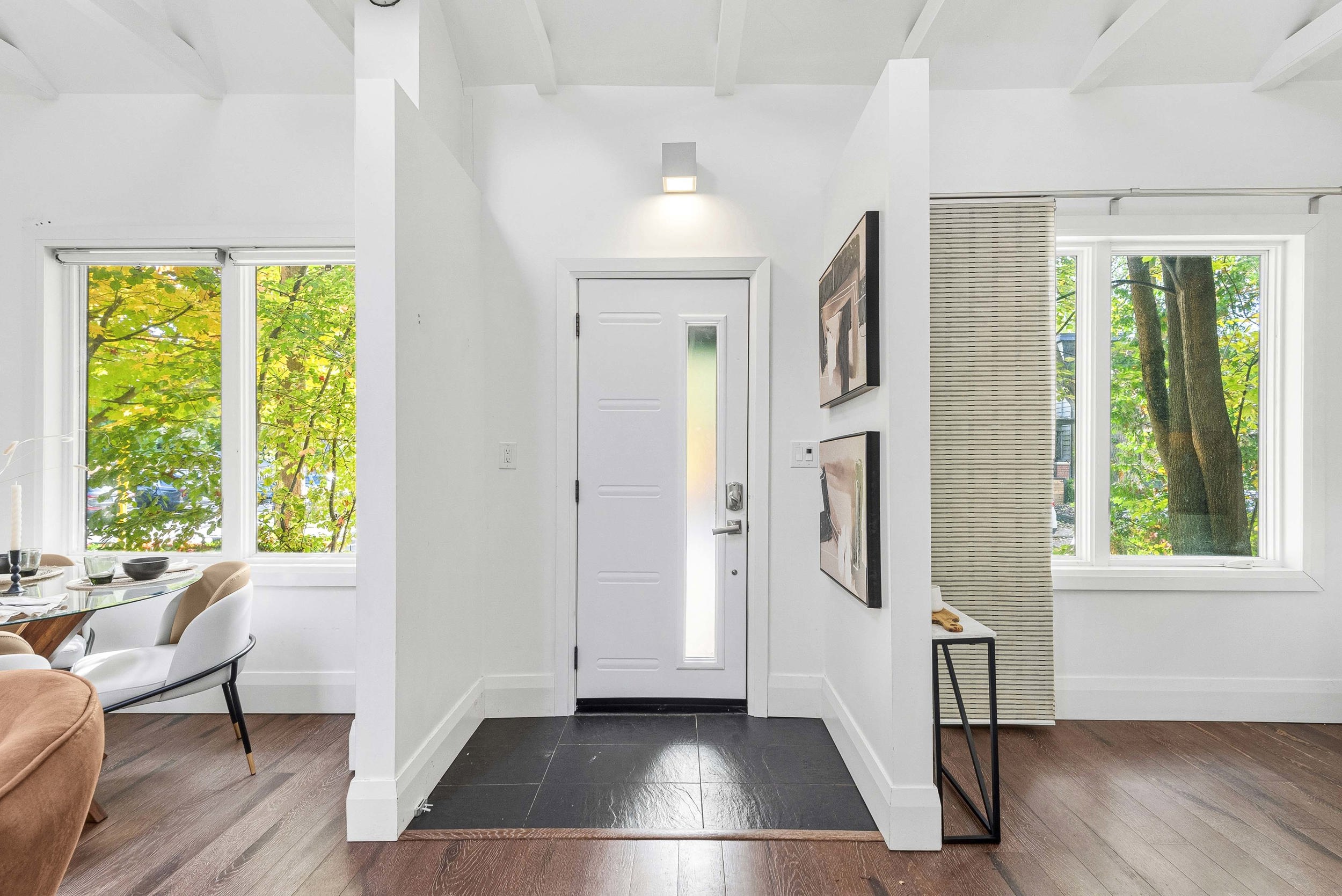 Framed by mature maples and a charming stone façade, this inviting 2-bed, 2-bath bungalow welcomes you with a crisp blue front door, black-trim windows and a classic covered stoop—perfect for morning coffee under the trees. The low-maintenance front yard and wrought-iron accents add character and curb appeal, while the separate lower entrance offers practical versatility. Best of all, the setting is unbeatable: our favourite part of this neighbourhood is the walkability. Tucked on a quiet, leafy street yet centrally located in Leslieville, you’re steps to boutiques, cafés, parks, transit and everything that makes the East End beloved—no car required. Inside, a welcoming foyer opens to airy, vaulted ceilings with exposed beams and oversized windows across an open-concept main floor finished in warm wood. The crisp white kitchen features Shaker cabinetry, stone counters, a gas range and stainless steel appliances, flowing to a sunlit dining area and an inviting living room—ideal for entertaining. Tucked at the rear, the serene primary bedroom overlooks the fenced yard and features excellent closet space and new carpet, while the bright second bedroom is perfect for guests, a nursery or a home office. A refreshed main-floor bath with sleek vanity and glass walk-in shower adds spa-like convenience. Downstairs, a bright, open rec room with pot lights and wood floors offers flexible space for movie nights, a play zone, a home gym or a quiet work nook, served by a second bath with a glass shower. The lower-level laundry is tucked away with full-size machines and extra storage, keeping day-to-day living streamlined. Additional perks include an owned hot water tank (HWT) for peace of mind. Outside, the private, fenced backyard enjoys a leafy canopy, a walk-out to a wood deck for easy BBQs, and a simple, low-maintenance footprint—ready for pets, play, or your own landscaping vision.