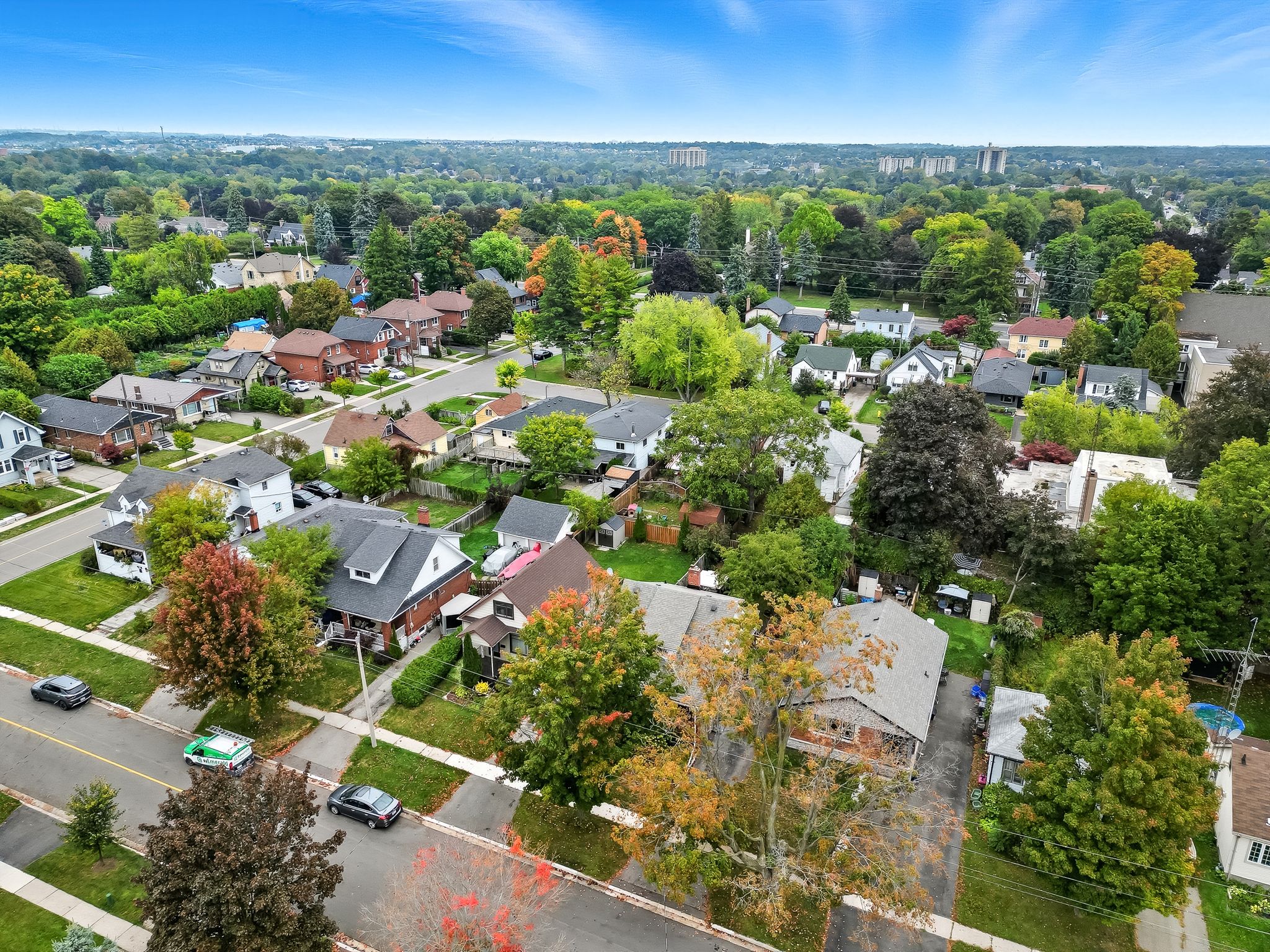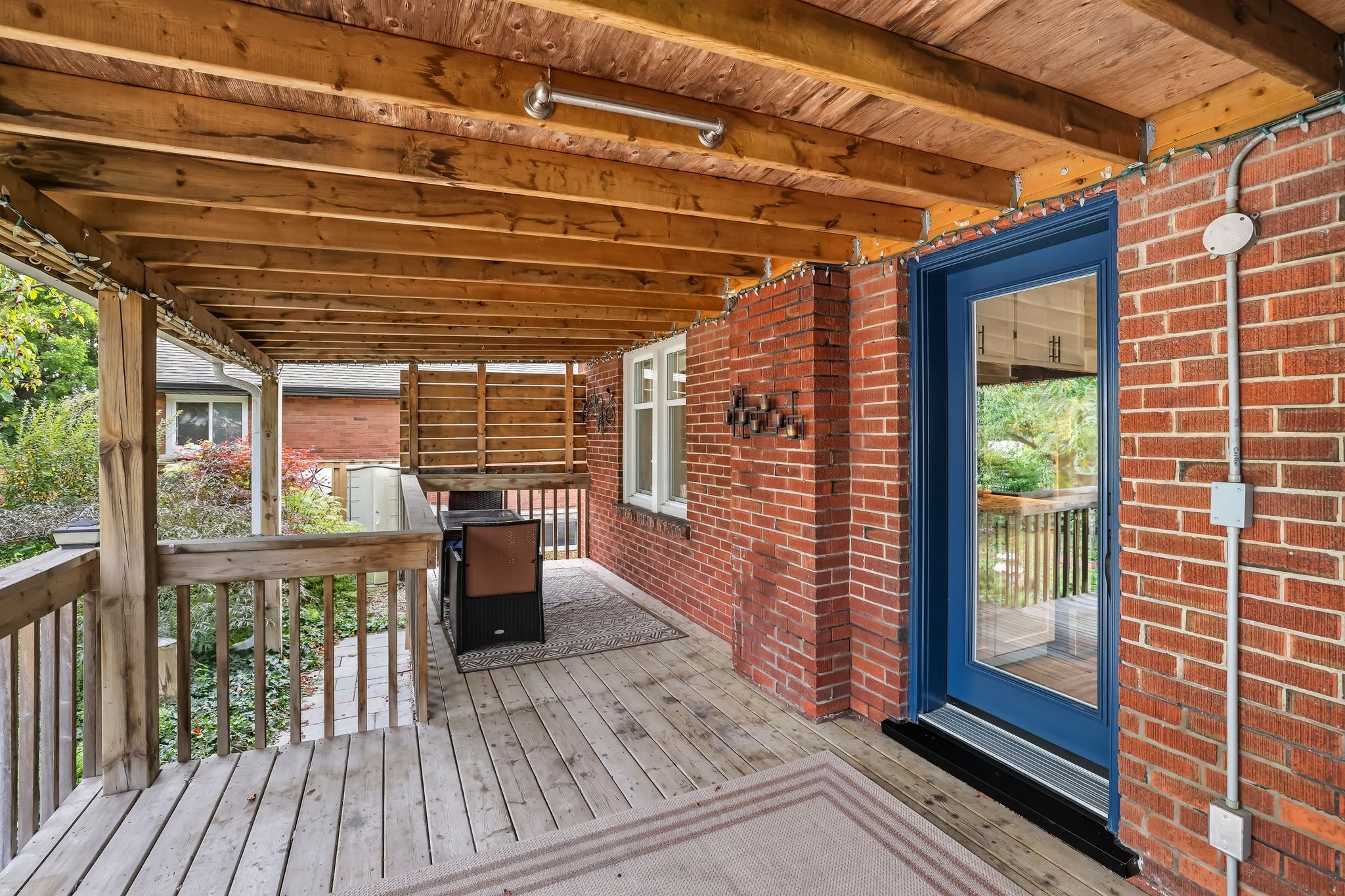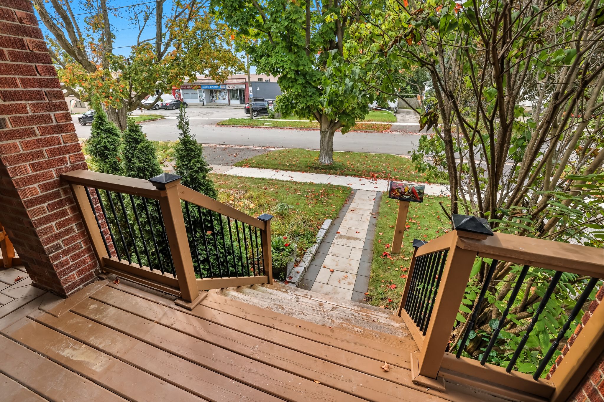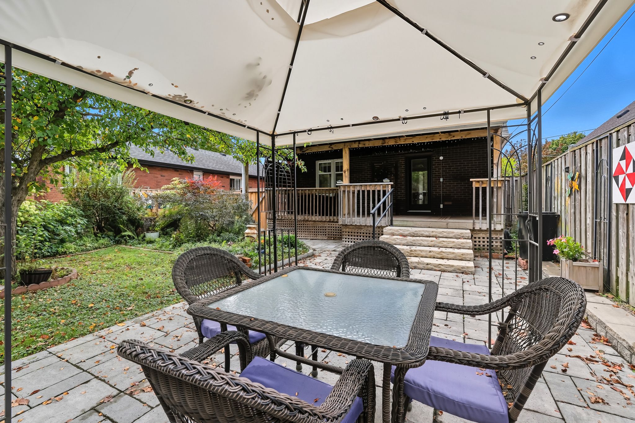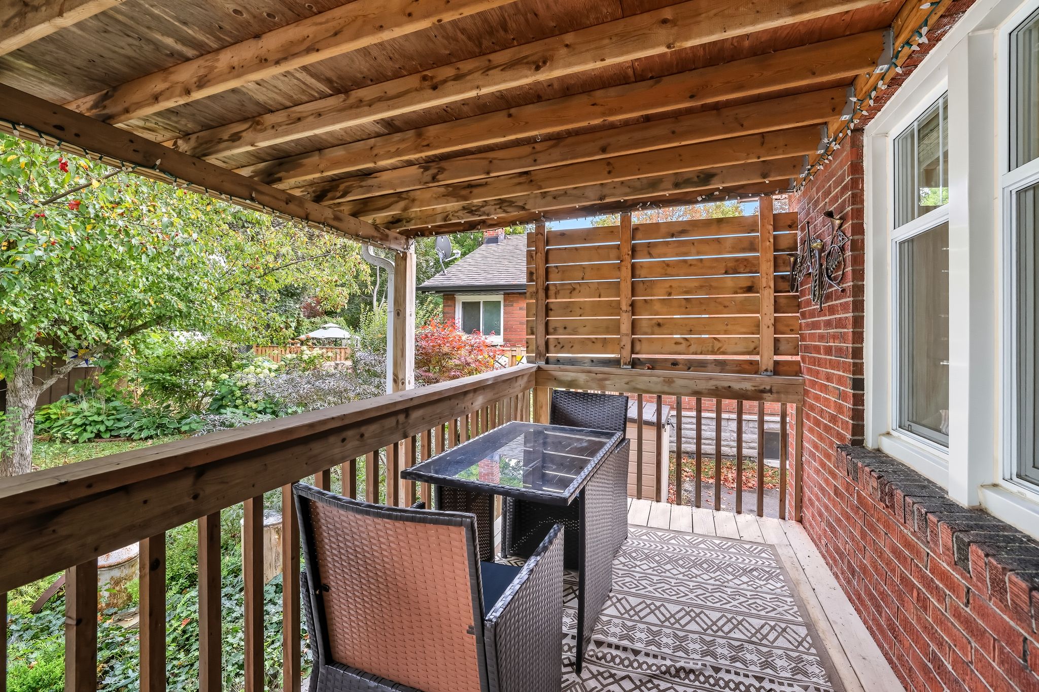 Set on a quiet, tree‑lined street, this brick home welcomes you with a tidy front garden, a stone walkway, & a large, sheltered front deck, perfect for morning coffee under the mature maples. From this elevated perch, you’ll enjoy a friendly, look‑out‑for‑each‑other community, with sidewalks that make it a genuinely good walking neighbourhood. In a great school district & surrounded by well‑kept homes, the setting feels calm, connected, & inviting from the moment you arrive. The main floor blends charm & function with a partial open-concept layout that’s perfect for entertaining. A bright Living Room with large windows & timeless trim flows to the elegant Dining Room, highlighted by a full built-in china cabinet. At the back, the updated gourmet Kitchen shines with high-end ‘23 appliances, quartz countertops, solid-wood cabinets, subway-tile backsplash, pot lights, & updated tile flooring, plus a convenient walkout to the covered deck—so cocktails can move effortlessly from prep to patio. Upstairs hosts 3 bright bedrooms & a full 4-pc bath, all with warm wood-style floors & generous windows. The bathroom blends cottage charm with modern updates: a Bathfitter tub/shower combo, fresh Moen fixtures & sink (‘23), & updated tile flooring (‘15). The versatile 3rd bedroom is a standout—complete with a built-in desk niche & a fun ladder leading to a cozy loft for reading, play, or extra storage. Thoughtful closets & shelving keep everything organized, making this level equal parts stylish & practical. Out back, a large, sheltered deck off the kitchen steps down to a stone patio & gazebo, wrapped by perennial beds, a flowering crabapple, & mature greenery—your own secret garden. The fully fenced yard is perfect for pets & play, with the patio & all gardens professionally installed by Michal Durham Landscaping. Practical updates elevate the exterior, too: gutter guards ‘25, all windows replaced in the early 2000s, plus both exterior doors updated in ‘24. Just move in & enjoy.