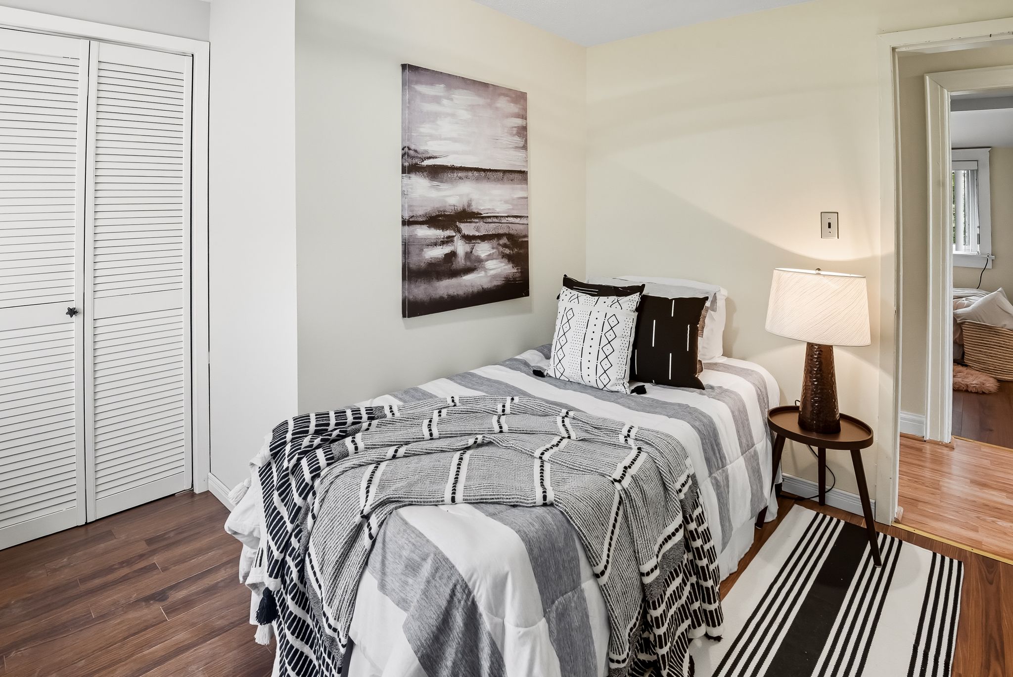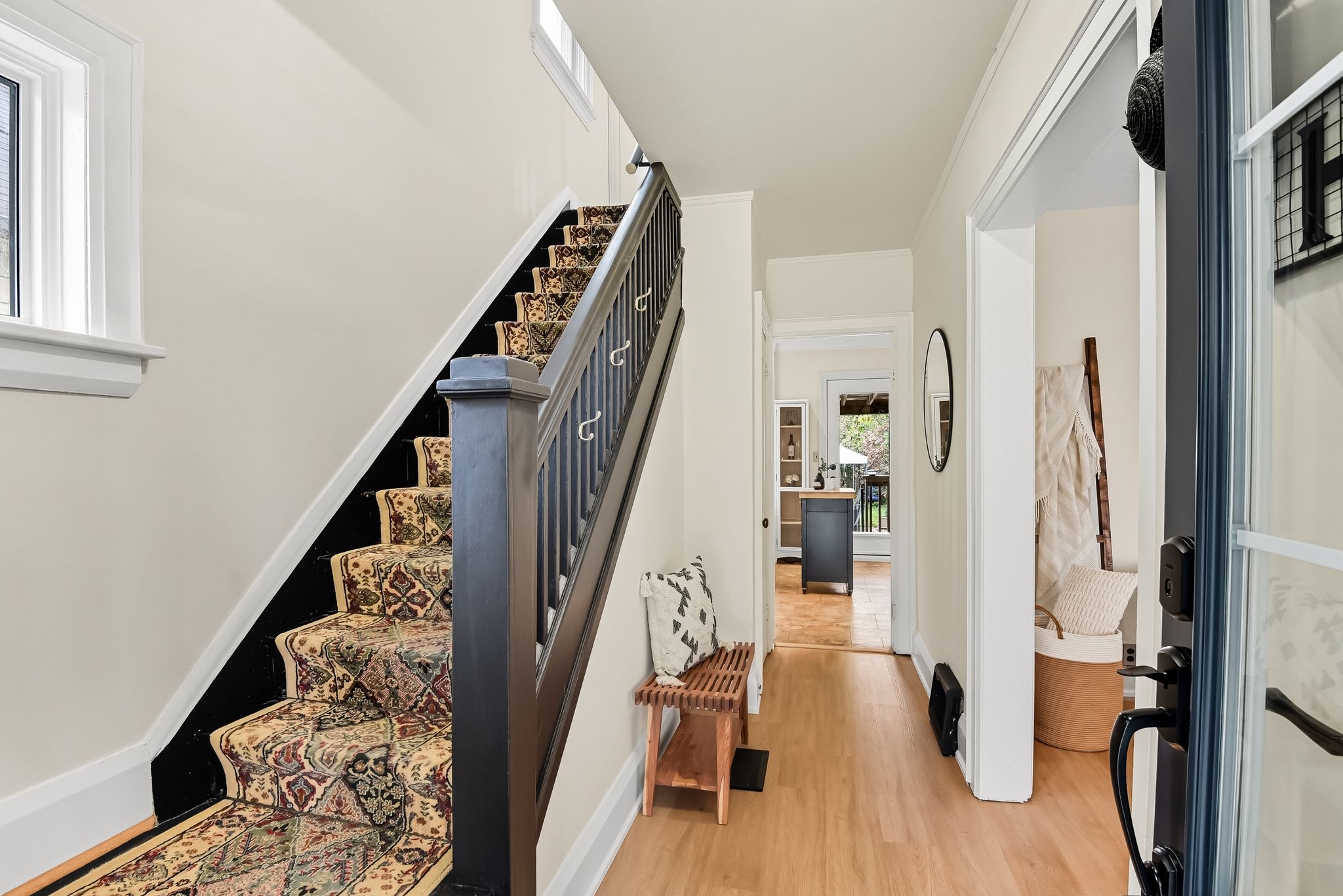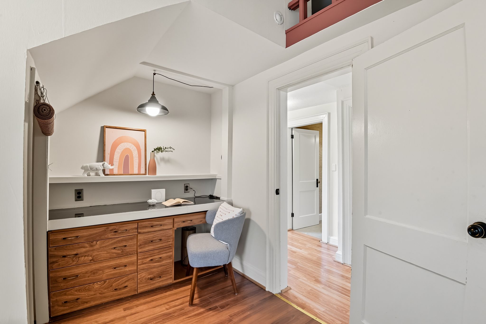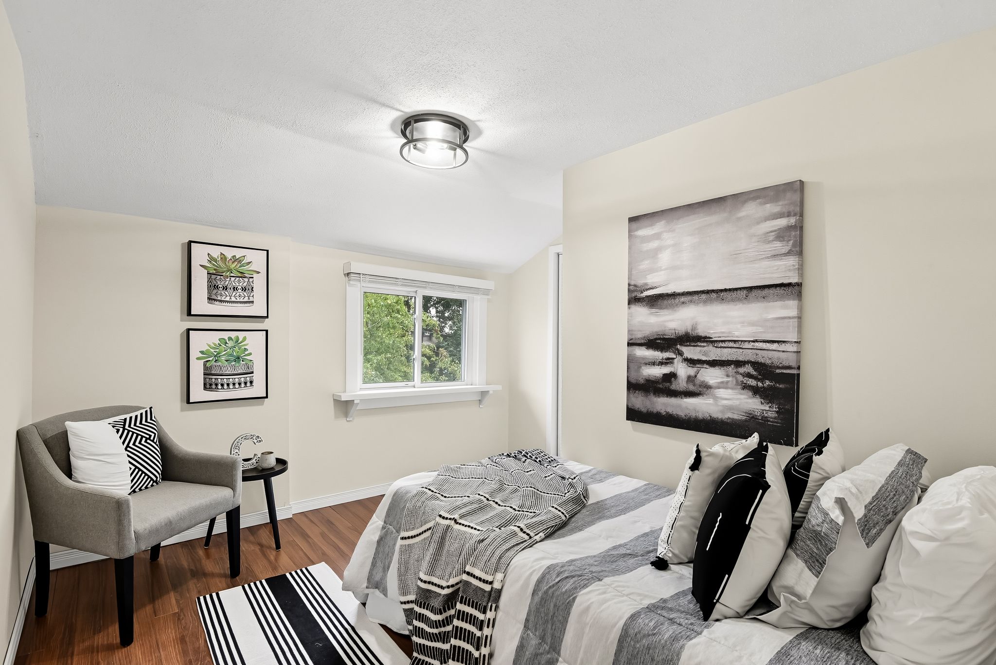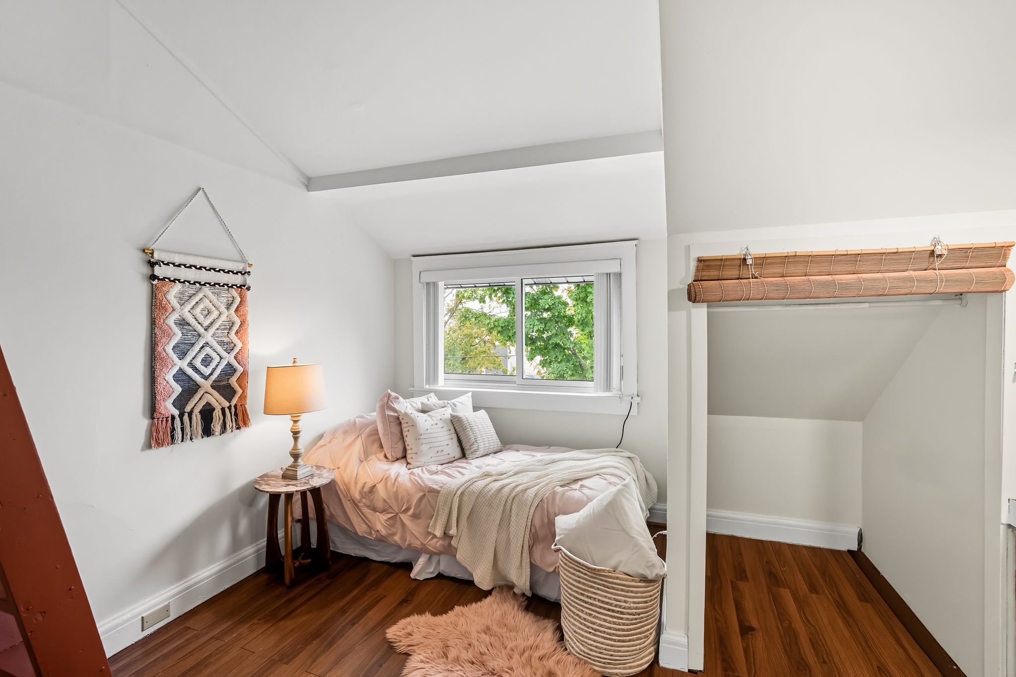 Set on a quiet, tree‑lined street, this brick home welcomes you with a tidy front garden, a stone walkway, & a large, sheltered front deck, perfect for morning coffee under the mature maples. From this elevated perch, you’ll enjoy a friendly, look‑out‑for‑each‑other community, with sidewalks that make it a genuinely good walking neighbourhood. In a great school district & surrounded by well‑kept homes, the setting feels calm, connected, & inviting from the moment you arrive. The main floor blends charm & function with a partial open-concept layout that’s perfect for entertaining. A bright Living Room with large windows & timeless trim flows to the elegant Dining Room, highlighted by a full built-in china cabinet. At the back, the updated gourmet Kitchen shines with high-end ‘23 appliances, quartz countertops, solid-wood cabinets, subway-tile backsplash, pot lights, & updated tile flooring, plus a convenient walkout to the covered deck—so cocktails can move effortlessly from prep to patio. Upstairs hosts 3 bright bedrooms & a full 4-pc bath, all with warm wood-style floors & generous windows. The bathroom blends cottage charm with modern updates: a Bathfitter tub/shower combo, fresh Moen fixtures & sink (‘23), & updated tile flooring (‘15). The versatile 3rd bedroom is a standout—complete with a built-in desk niche & a fun ladder leading to a cozy loft for reading, play, or extra storage. Thoughtful closets & shelving keep everything organized, making this level equal parts stylish & practical. Out back, a large, sheltered deck off the kitchen steps down to a stone patio & gazebo, wrapped by perennial beds, a flowering crabapple, & mature greenery—your own secret garden. The fully fenced yard is perfect for pets & play, with the patio & all gardens professionally installed by Michal Durham Landscaping. Practical updates elevate the exterior, too: gutter guards ‘25, all windows replaced in the early 2000s, plus both exterior doors updated in ‘24. Just move in & enjoy.